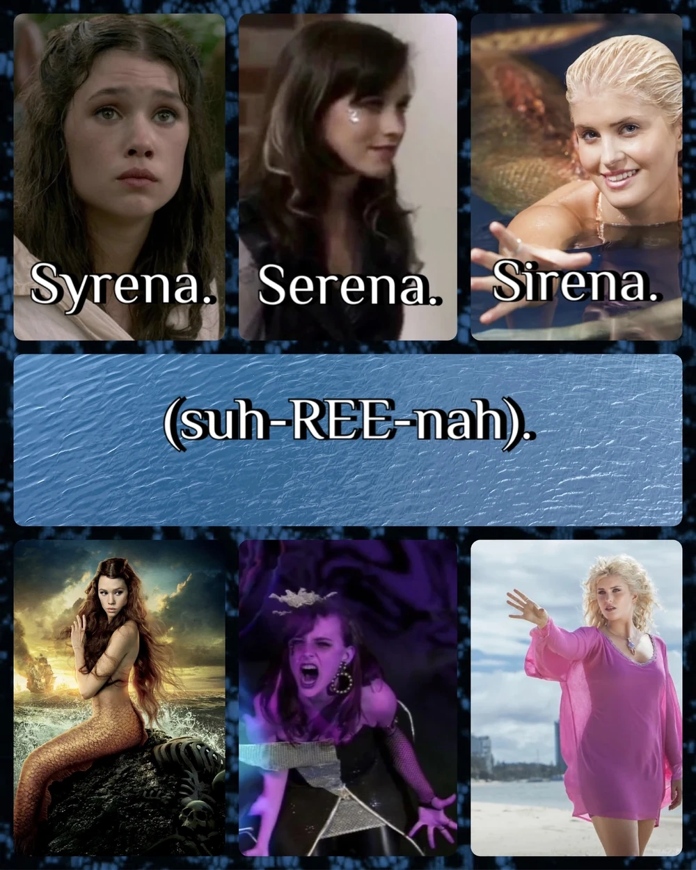 "Sirena" can also be spelled like this "Serena" or "Syrena", but they all have the same pronunciation (suh-REE-nah). Each spelling has a different meaning to the other 2, even though they’re all pronounced the exact same way.